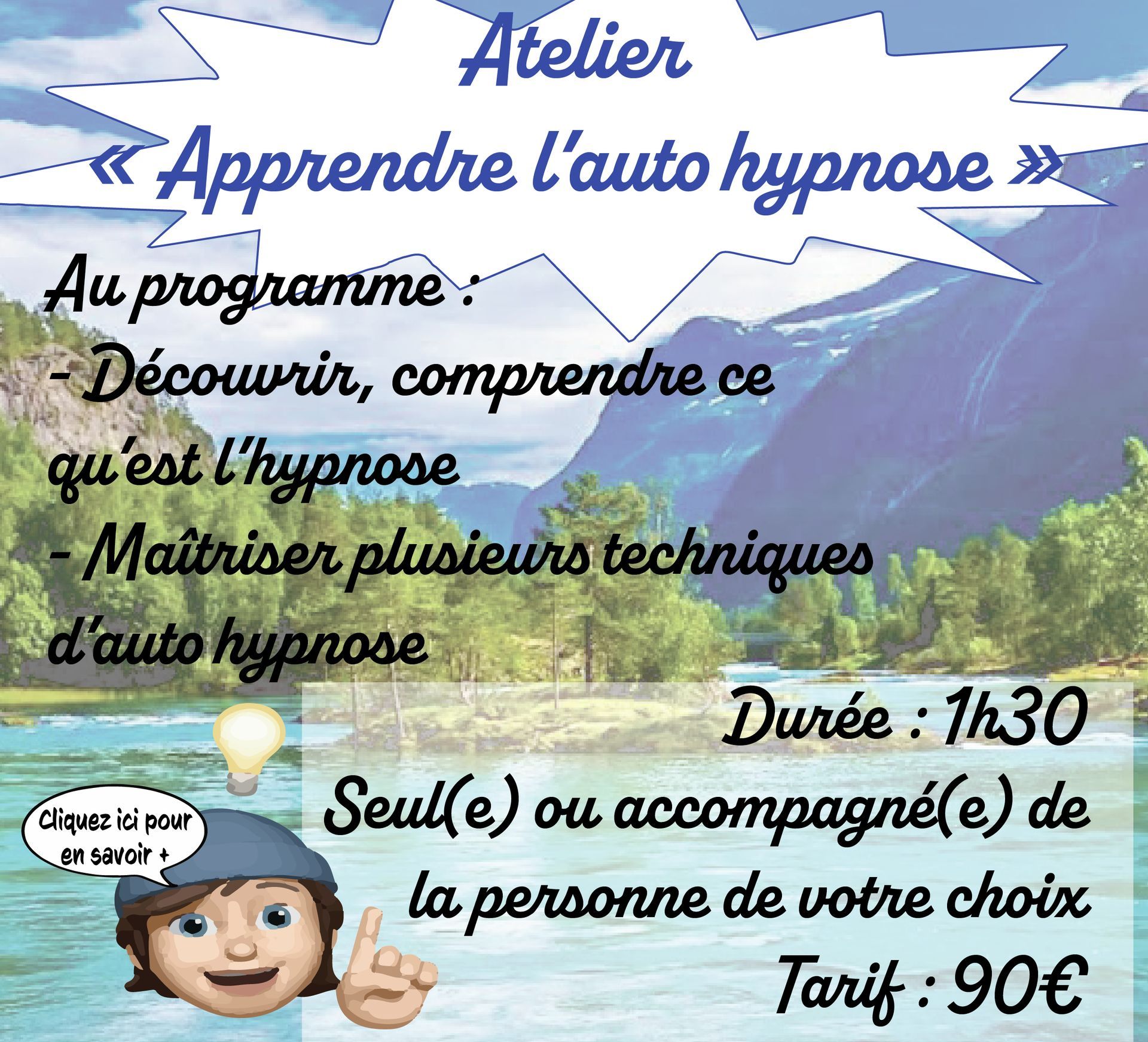 Une formule d’1h30 durant laquelle je vous explique ce qu’est l’hypnose et vous apprends quelques techniques d’auto hypnose.